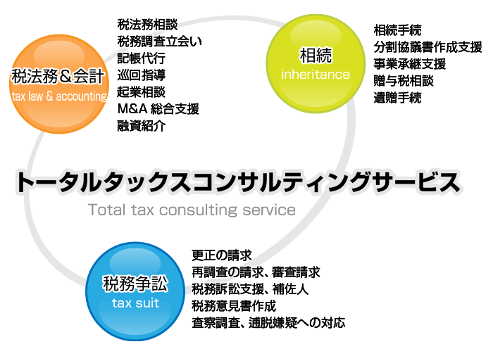 税法はもとより、隣接法分野の知識や経験豊かな専門家が、法人様及び個人様の税法務及び会計全般・相続並びに贈与・税務争訟(税務調査立会い・再調査の請求・更正の請求・審査請求・補佐人を含む訴訟支援)・各種意見書等の作成、その他、任意後見人受任・遺言執行者受任、死因贈与執行者等の受任につきましては、スタッフが個人として責任をもって承ります。